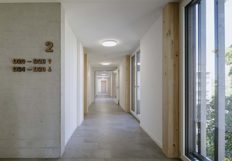 Der fünfgeschossige Bau markiert den Auftakt zum Areal des Alters- und Pflegezentrums, das auch den Betrieb der Wohnungen übernimmt. Im Erdgeschoss sind Gemeinschafts- und Besprechungsräume sowie die Spitex untergebracht. In den Obergeschossen befinden sich die barrierefreien Wohnungen in unterschiedlichen Grössen. Das Untergeschoss erweitert die bestehende Tiefgarage und integriert die erforderlichen Technikräume.